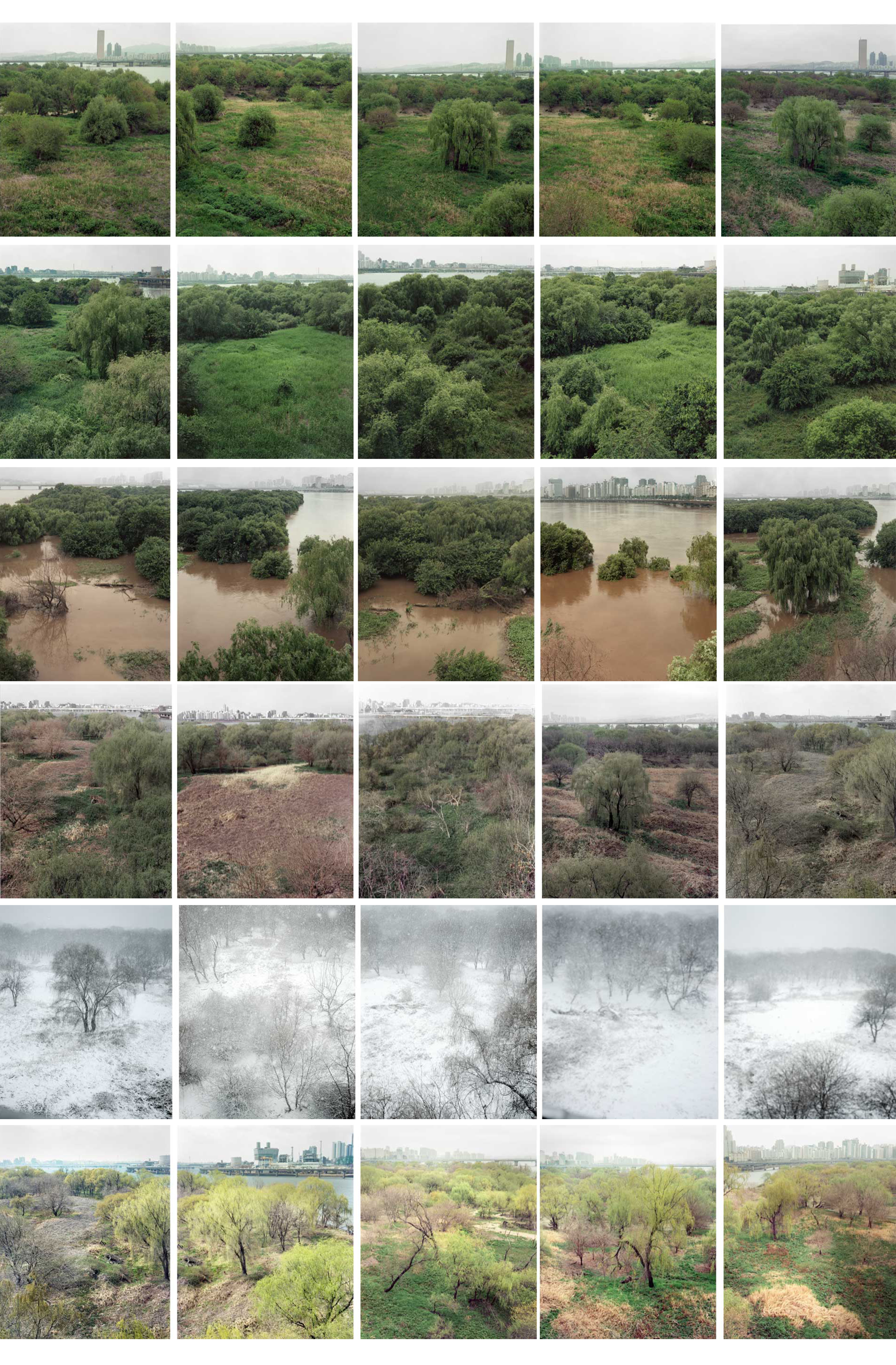 역사적인 굴곡이나 그 장소와 거기에 살았던 사람들이 경험했던 아픔으로 작업을 시작하고 싶지는 않았어요. 그렇기 때문에 내가 밤섬 바깥에 있는 존재라는 인식을 놓지 않았어요. 서강대교 위에서 밤섬을 찍었을 때에 그 공간이 독특하게 다가왔던 것은, 그곳이 제가 밤섬을 관람할 수 있는 유일한 위치이자 나와의 거리감을 가늠할 수 있는 곳이기 때문이에요. 사진을 찍기 위해서는 대형 카메라를 들고 사다리를 놓아 대교 위로 올라야 해요. 그 곳은 밤섬과 같은 선상의 다리이고, 섬과 가까워지는 듯 싶지만 실제로 밤섬까지 진입할 수 없는 뷰포인트예요. 할머니 할아버지들의 기억을 계속 청취해도 좁혀지지 않는 거리감처럼 밤섬과 저 사이의 거리감도 계속 존재할 수밖에 없죠. 이 거리감 자체가 단절과 동의어는 아니에요. “접속”보다는 “일정한 거리감”을 잘 이해하고 제가 사는 시간과 그들이 살았던 시간을 분리하는 것 자체가 필요한 경험이었어요.