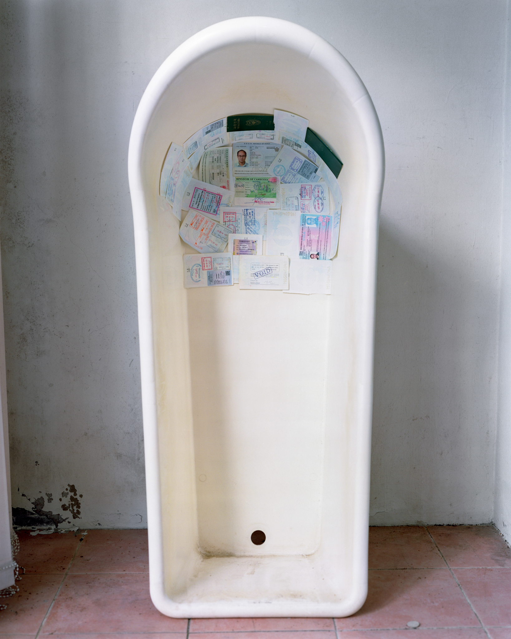 욕조를 세워놓은 사진은, 아빠 여권 면들을 하나하나 뜯어서 붙인 거예요. 아빠가 운동 유공자가 되기 전까지는, 여권에 빨간 줄이 그어져 있어서 해외를 못 나갔어요. 출국 결격 사유가 되는 거죠. 그래서 아빠가 해외에 가고 싶어도, 일을 하러 가고 싶어도 못 갔던 시기가 있었어요. 그 빨간 줄이 지워지고 나서야 해외여행을 엄청 많이 다니셨거든요. 본인한테 한이었던 것 같아요. 그래서 스탬프 찍힌 면들을 다 모아서 욕조에 붙였어요. 욕조라는 오브제는, 어디서 봤는지 기억은 안 나는데, 내 눈물로 이 욕조를 다 채우면 이 슬픔에서 벗어날 수 있을까? 라는 느낌의 노래 가사에서 빌려온 이미지였어요. 마침 집 베란다에 욕조도 있었고, 한 번 이 스탬프로 욕조를 채워볼까? 해서 시작했는데, 당연히 욕조는 안 채워지죠. 아무리 스탬프가 많아도. 그 지점에서 오는 이야기가 있을 것 같아서 같이 찍게 됐어요.
